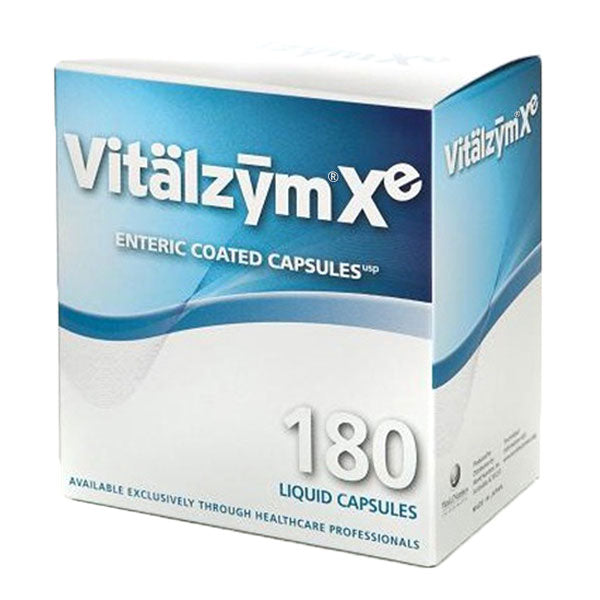 Vitälzӯm® Xe is the world's leading professional-strength systemic enzyme supplement available exclusively through healthcare practitioners. Vitälzӯm® Xe features an unmatched proprietary blend that combines potent proteolytic enzymes, digestive enzymes, and antioxidants that enhance its effectiveness. The systemic enzyme blend is formulated around serrapeptase's power, a non-animal-derived enzyme, coupled with the fruit enzymes bromelain and papain. Additional ingredients include amylase, protease, lipase, rutin, and amla extract. This professional strength formula delivers twice the potency of our Vitälzӯm® liquid gel capsules and is available in 180-count boxes.
